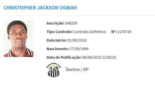 Esse é o caso mais estranho das Feras que o Santos teve. Há pouquíssimos registros da passagem do nigeriano Christopher Ogwah pelo alvinegro. Por ser estrangeiro e na época ter apenas 19 anos, o normal seria muitas notícias sobre, mas não há nada, ao menos, foi o que verificamos. Existem três registros de jogos de Ogwah pelo clube. O primeiro contra o Santana, quando entrou aos 40 minutos do segundo tempo, na vitória por 2 a 0 pelo Amapaense, em 23 de junho. Foi relacionado duas vezes na Série D 2016: ficou no banco contra o Águia de Marabá (26 de junho) e entrou no decorrer da partida contra o Moto Club (17 de julho). Em sites como o oGol.com, esse é o único clube pelo qual o jogador é registrado. Fica o mistério.