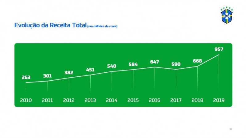O salto nos lucros da CBF não foi um fato exclusivo do ano passado. Desde 2010, quando foi apresentado um lucro de R$263 milhões, a receita total da entidade máxima do futebol brasileiro caiu apenas uma vez, em 2017. Nos últimos nove anos, a receita da CBF cresceu 263%.