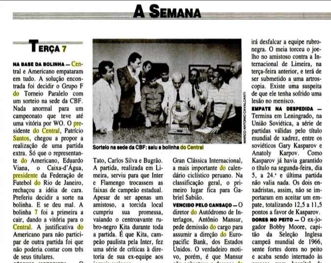 Com Central e Americano empatados, a decisão do acesso à Taça de Ouro do Grupo F foi feita em um sorteio com a presença do presidente do Central, Patrício Santos e do presidente do Americano, Eduardo Viana, mais conhecido como “Caixa d’Água” e que também era presidente da Federação de Futebol do Rio de Janeiro. Isto ocorreu no dia 7 de outubro de 1986 na sede da CBF, no Rio de Janeiro. Patrício Santos sugeriu a realização de uma partida extra entre Central e Americano como forma de desempate, mas a proposta foi negada por Eduarda Viana, pois a equipe de Campos não poderia contar com 3 titulares. Eduardo propôs um “cara ou coroa”, já que o hábito faz parte do futebol, no momento em que os capitães dos dois times escolhem em qual lado do campo ficarão suas equipes no início da partida. O alto-comando do Departamento de Futebol da CBF recusou a oferta e determinou que se cumprisse o regulamento que previa o sorteio em caso de empate em todos os critérios.