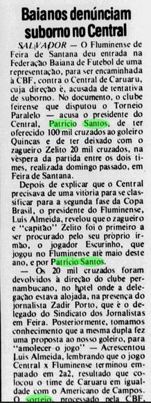 O Jornal dos Sports e o Jornal do Brasil de outubro de 1986 relataram uma suposta existência de “mala preta” ou “mala branca” em jogos do Grupo F. O Flu de Feira deu entrada na Federação Baiana de Futebol com uma representação contra a diretoria do Central por tentativa de suborno de dois jogadores do Fluminense para que eles fizessem “corpo mole” no jogo decisivo contra a Patativa. A representação que seria encaminhada à CBF afirmava que o presidente do Central, Patrício Santos e o ex-jogador do Fluminense de Feira, Escurinho, teriam oferecido 100 mil cruzados para o goleiro Quincas e 20 mil para o zagueiro Zelito (irmão de Escurinho) do tricolor do interior baiano. O presidente do Flu, Luis Almeida, disse que os 20 mil cruzados foram devolvidos a diretoria do Central no hotel que o clube pernambucano estava concentrado na Bahia na presença do jornalista Zadir Porto, delegado do Sindicato dos Jornalistas de Feira. O dirigente do Central se defendeu, alegando que o cheque era um prêmio pelo empate do Fluminense de Feira com o Americano, que ajudou os centralinos na competição.