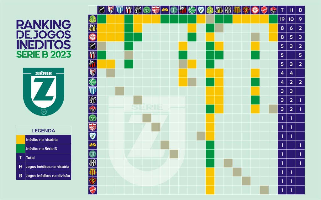 Quando se completa a última rodada de uma Série B (e Série A), a competição finaliza os 190 jogos previstos para realização. Na edição 2023, a novidade é a presença do Mirassol, que disputa a divisão pela primeira vez, um debutante, como gostamos de abordar. Sendo assim, todos os jogos do clube no primeiro turno serão inéditos, ou seja, metade da lista de 38 partidas que nunca foram realizadas na divisão.