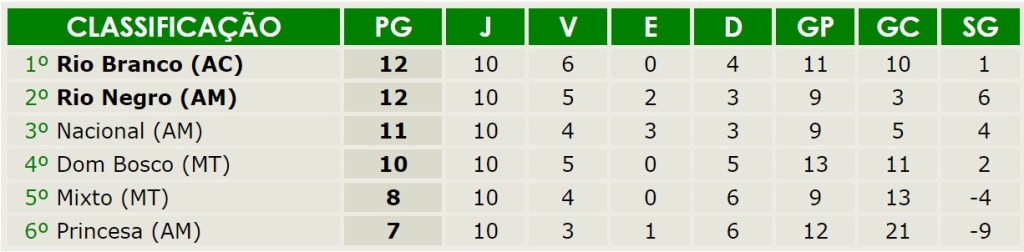Nos confrontos amazonenses, a vantagem foi do Nacional, que terminou invicto, com uma vitória e três empates. O Rio Negro foi o segundo melhor e o Princesa ficou em terceiro.