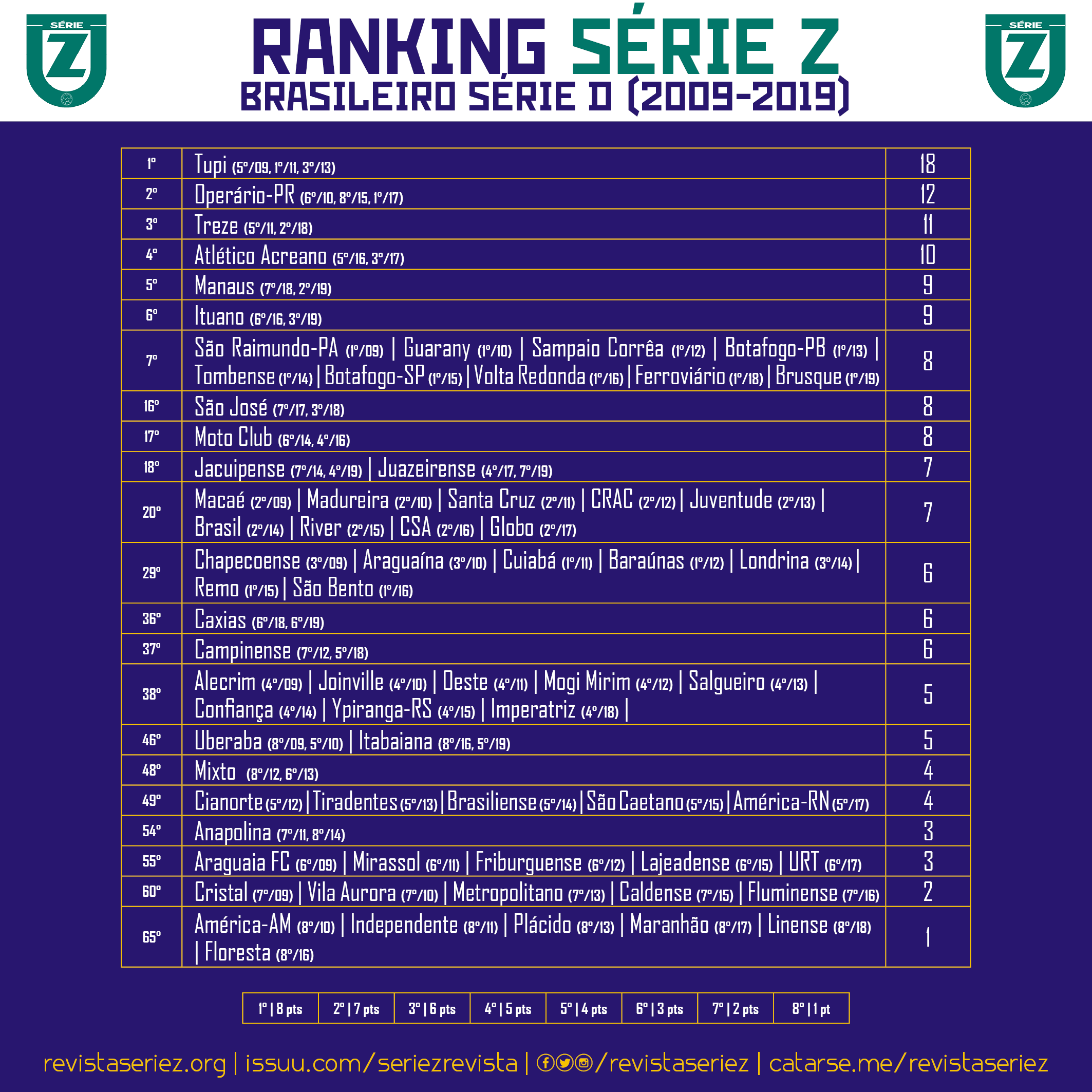 Desde o Guia da Série D 2017, a Revista Série Z apresenta um ranking da competição com apenas algumas equipes. A inspiração foi a Revista Placar, que reúne os 10 melhores clubes de cada edição da Série A desde 1971. No nosso ranking, uma diferença, apenas os oito melhores de cada edição da Série D, pois estes disputaram as quartas de final, fase que define os acessos da divisão.